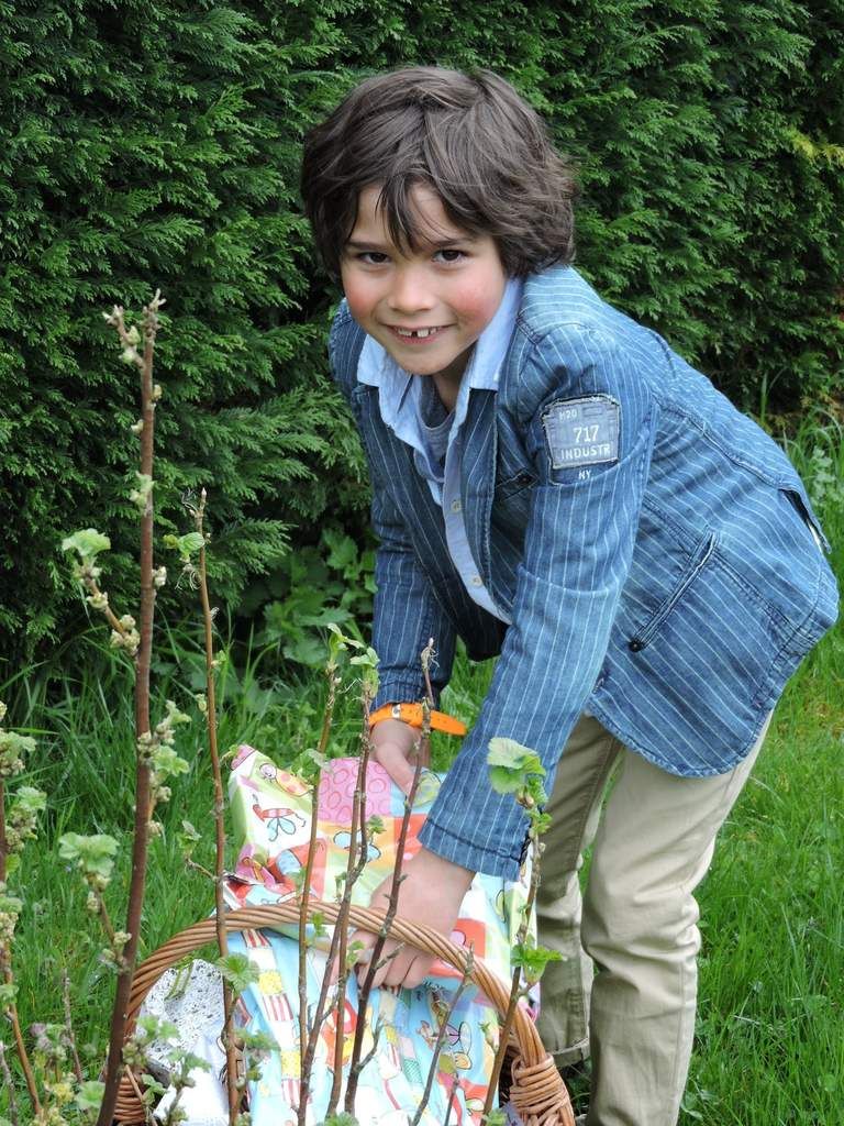 Des petites boites pour chaque invités,des paniers remplis de chocolats,des petits nids sous cloches et des fleurs pour une ambiance printanière sans oublier un petit garçon heureux de "sa cueillette "....